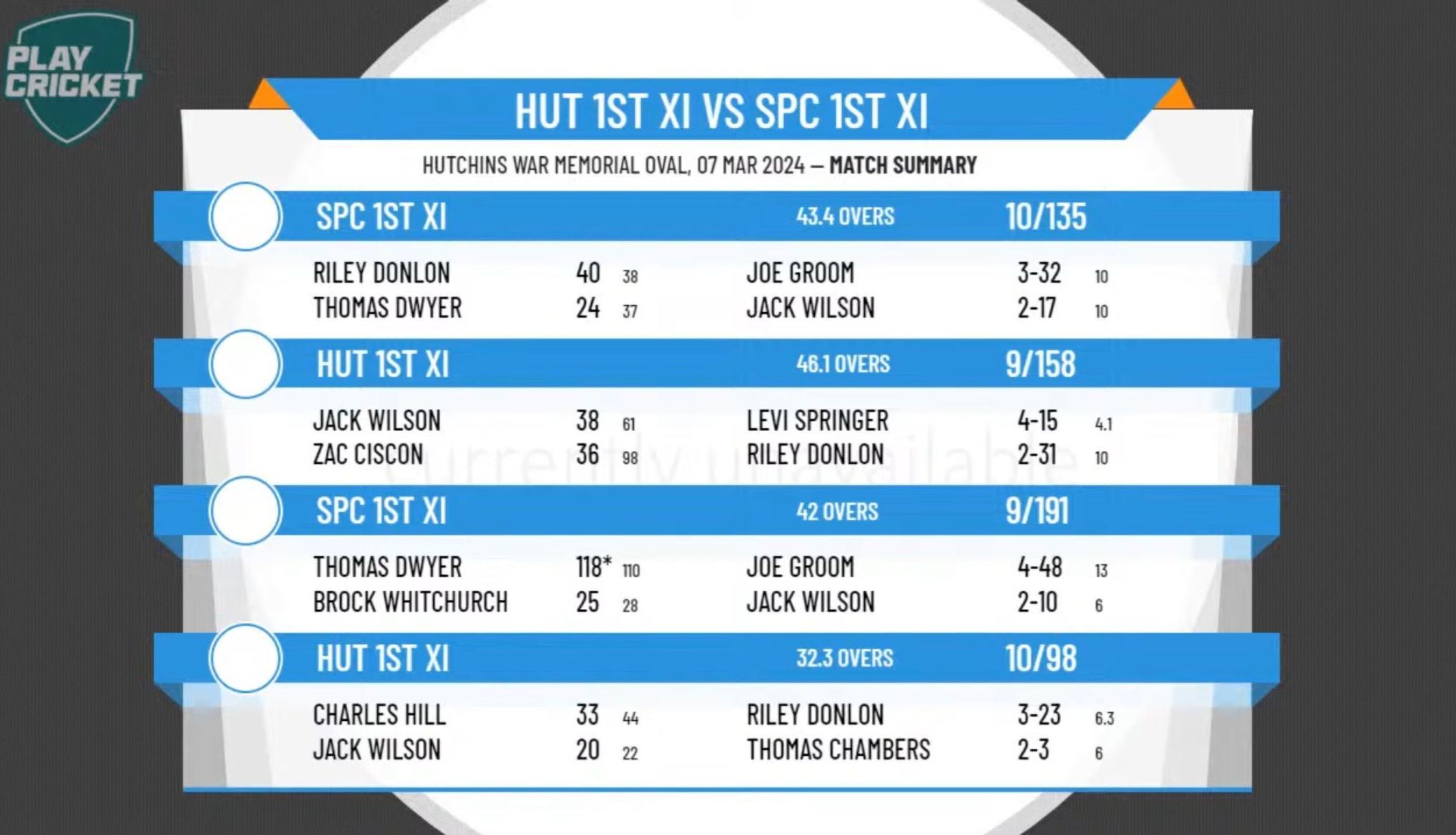 SPC 135 & 9 – 191 def HUT 158 & 98 (outright victory, after trailing on 1st innings)